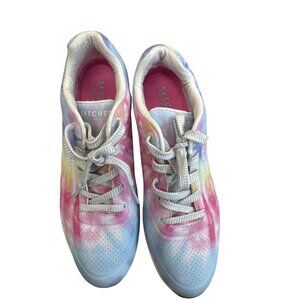 These Skechers sneakers offer a stylish tie-dye design combined with comfort and durability, perfect for athletic activities or casual wear. The breathable material and sturdy sole enhance performance while maintaining a fashionable look. They are in very good condition and ready to ship fast. SKU 7707