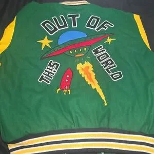 Vibrant varsity jacket with bold 'F' patch. Features 'Secret Mission Earth' design. Yellow sleeves for a striking look. Ideal for casual outings.