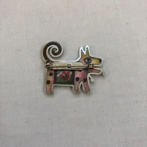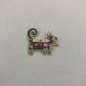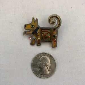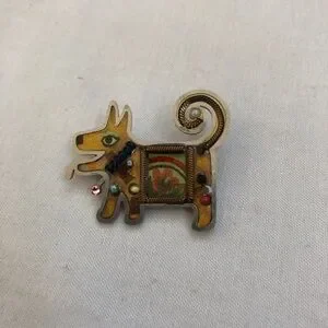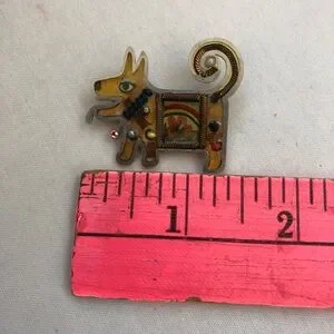 Pin is about 1 1/2", has multiple color beads and is yellow tone surrounded by silver material. There is a flower in the center of the puppy. Glossy finish.