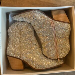 Incredible rhinestone ankle boots by Betsey Johnson! Super sparkly! Wore them twice over a festival weekend so pretty much as new. Very comfy and sure to get you lots of compliments! Size 9.5, style is SB-DIVA