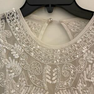 I bought this on Ebay as a backup wedding dress when my original dress was delayed in its delivery. I never wore it, but it was definitely pre-worn when I purchased it. It’s a beautiful dress with a beaded sheer bodice and gauzy skirt. White interior v-neck lining. There are a few discolorations that would probably come out with cleaning, including at the back of the neck and at the hem. The skirt is very long; I am 5’4” and would have completely removed the bottom discoloration when I hemmed it to my height. Comes with original garment bag.
