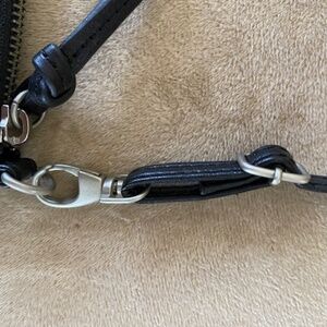 Used once; great condition; measurement in picture for strap length is extended to its longest length (can be shortened to about half that shown). Black soft leather with silver hardware.