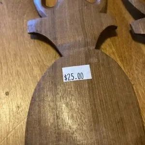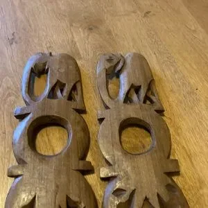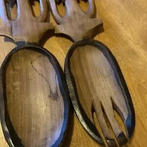 Vintage hand carved wooden spoon and fork salad set. On the handle is a carved elephant on top with a palm tree underneath. This is a beautiful set . spoon and fork is 16" long and 3" wide.