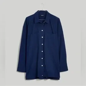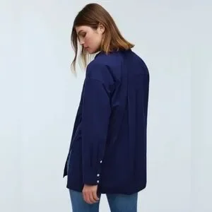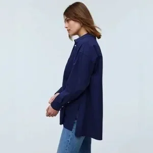 Signature Poplin, this navy blue button-up shirt has an oversized fit for a more relaxed vibe. Traditional design details, like double patch chest pockets, breezy side vents and a straight hem, make it a wardrobe essential. designed to hit at high hip or below; tuckable. 100% cotton.