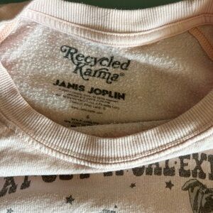A 1969 image of iconic JANIS JOPLIN probably taken from an old venue poster & screen printed onto a light pink sweatshirt. The sweatshirt is short. (15" from top neckline to bottom banding) with long sleeves. Size SMALL and in excellent condition.