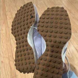 Stylish New Balance sneakers. Features a unique purple and white design. Comfortable and trendy.