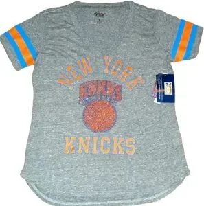 New York Knicks (WOMENS) V- Neck T-Shirt Adult sz. Large. This is Brand New with Tags! The front has the bedazzled rhinestone style on "KNICKS" logo on it. It is made of 38% cotton and 50% polyester material. It measures from top of collar to bottom of shirt is 28 inches, and from armpit to armpit is 19 inches Made by G-III 4 Her Carl Banks.