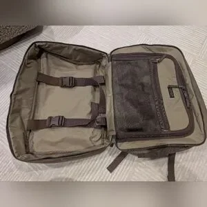 The main compartment opens clamshell-style for easy visibility and access to its contents. The interior features adjustable, buckling straps to keep folded clothes secure on one side, and layered full-sized pockets for organization on the other. The exterior features zippered and snapped pockets for quick-access essentials. The lightweight 500D Cordura® nylon is highly abrasion-resistant and reinforced with strong ripstop cross-threads to increase its tear strength.