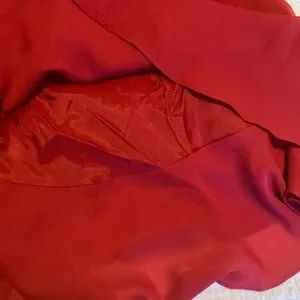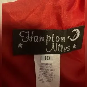 Women’s size 10 HAMPTON NITES dress. 100% polyester. Lightly used red dress with fun scalloped edges along hem and comes along with matching scarf. Length is right around knees and zipper down the back is about 1/2. Very flattering red! ❤️