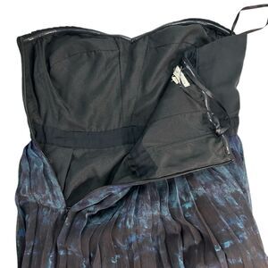 This Urban Outfitters dress features a geometric ombre design in black and blue, with pleated and layered accents for a stylish look. The sleeveless sweetheart neckline and side slit add a touch of allure, while the lightweight and lined construction makes it suitable for various occasions from casual to formal. The maxi length and zipper closure give it a trendy vibe, perfect for summer, fall, or spring events. Overall, this dress embodies a mix of artful, bohemian, and city-inspired styles, making it a versatile and chic choice for any fashion-forward woman. It’s perfect for any event from date night, dances, parties, or even galas.