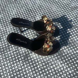 Stylish brown heeled sandals. Features a beautiful floral embellishment. Perfect for a night out. Slight elements of wear and tear present. Shoe lining at sole needs some gluing.