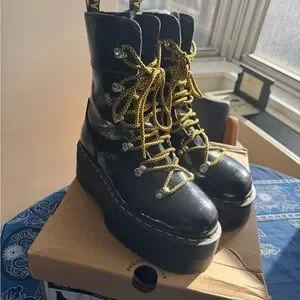 Stylish black platform boots. Features bold yellow laces. Perfect for a trendy look. GHILANA MAX Dr Martens! Great boot worn once. Looks great with everything! Doc marten