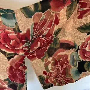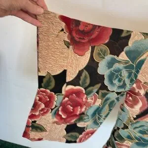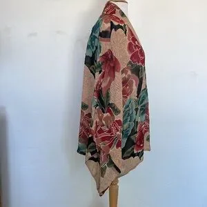 This is so pretty and lightweight with true Kimono Styling and Kimono Sleeves. The colors are lovely and some of the larger flowers are beaded. This 100% Rayon cardigan can be hand washed or dry cleaned, The lay flat measurements are open front chest 22", sleeve 13" x 18" and front length is 27"/ back length 29". This Kimono is preowned however was never worn. It is in excellent condition with no rips or stains.
