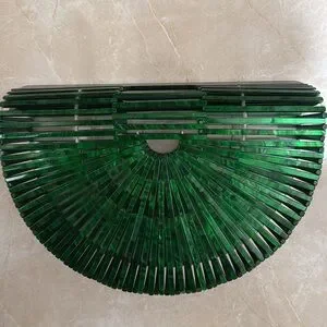 Embrace vacation vibes with the trendy Green Acrylic Ark Fan Bag! This cool clutch is a must-have addition to your wardrobe with its unique shape and playful marbled design. Style it with a flowy sundress, sandals, and sunnies for the ultimate boho-chic look.
