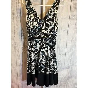 This is a Jones Wear women's dress in size 14, featuring a white, black, and blue floral print on a knee-length canvas fabric. The sleeveless dress has a V-neckline and comes with a belt. It is designed in a maxi style with a zip closure and requires dry cleaning. The material consists of spandex and cotton, making it a comfortable and stylish choice for various occasions.