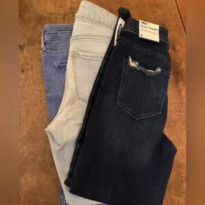 3 pairs of old navy jeans. All size 2. 1 pair new with tags, one pair new without tags and one pair was worn twice. All super cute and great variety of washes to add to your wardrobe.