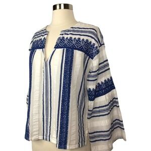 Joie Selbea Top XS Regatta Blue Striped Embroidered Bell Sleeve Cotton Blouse