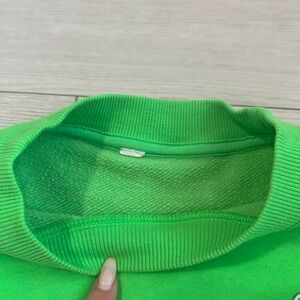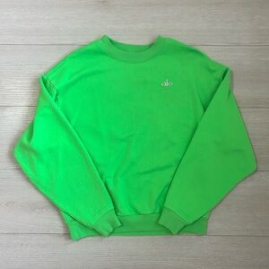 Alo Yoga Accolade Crew Neck Pullover in Green Glow. No size tag. Measurements in photos. Approximately a size XS. Good used condition. Minor faint mark shown in photos, slight pilling. Rare color.