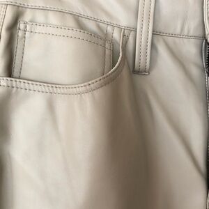 Worn once, these faux leather pants are in perfect condition with no blemishes. They are a taupe/khaki color in bootcut style. Leg inseam is roughly 26 inches. Pockets in front and back. Smoke-free and pet-free home