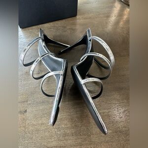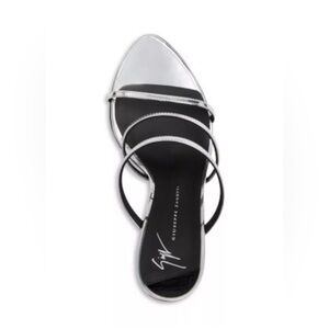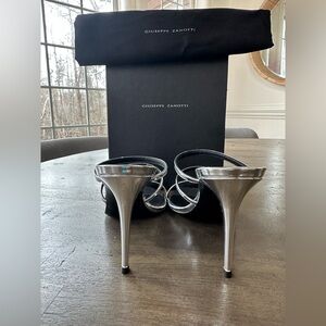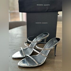 Top notch Designer GIUSEPPE ZANOTTI, Made in Italy. Womens Silver Padded Strappy Clandestino Pointed Toe Stiletto Slip On Heeled Sandal 38.5