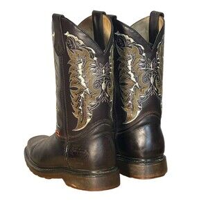 Step out in style with these beautiful cowboy boots from Chaparral. Made with high-quality leather, these boots are well-crafted and built to last. The brown color and western style make them a perfect addition to any cowboy-themed outfit. The High Resistaant All Terrain tread pattern on the outsole adds an extra touch of authenticity to these stylish boots. They are available in size 9 and are perfect for any man looking for a comfortable and fashionable footwear option. Gently used condition
