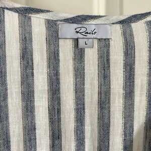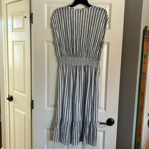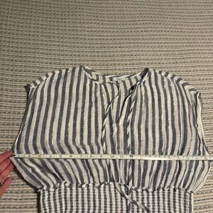 Sleeveless/slight capped sleeves. Navy blue and white striped with metallic thin stripe weaved throughout. Top is not lined (see photo), bottom is lined. Side pockets! Dress is comfy and soft and has pockets. Perfect for a summer wedding.