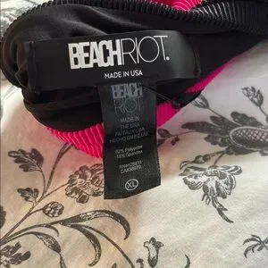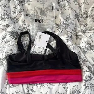 Stylish bikini top with a scoop neckline. Features a vibrant pink band. Perfect for beach days!!