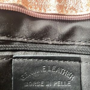 Italian leather rose gold purse. Genuine Italian leather, square crossbody body style, shimmery rose gold finish, flap closure, exterior zipper pocket, black fabric lined interior, interior zippered pocket, and exterior back zippered pocket. Hardly used!