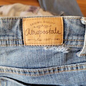 2 pair women's jeans. American Eagle size 4 short slim boot with stretch. Medium blue and in very good condition. Second pair is Aeropostale size 4 short Chelsea boot very light blue. Also in very good condition EXCEPT.....there is a hole by the Aeropostale tag on the back right waist band. It looks like their machine may have caught it when sewing on the tag in the factory. If you cut the fuzzies off, it would most likely not show when worn or be under your shirt. Please see the photo. I hate this because this is a very nice pair of jeans except for one flaw.