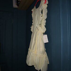 "The Dole Whip Bebe Pinafore Dress by Selkie offers a playful and charming style that's perfect for sunny days. With its light yellow hue and ruffled details, it exudes a whimsical and youthful vibe. The knee-length design and sleeveless silhouette provide a breezy comfort, making it ideal for picnics, casual outings, or just embracing a cheerful, retro-inspired look."