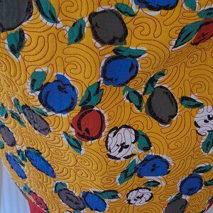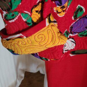 Jacket colors on a red ground: purple, yellow, green, white, khaki, black, 2 front pockets. Lining has all these colors on a yellow ground. Red stitching outside and inside. Cotton. Removable shoulder pads. Loose fitting, no closure.