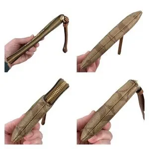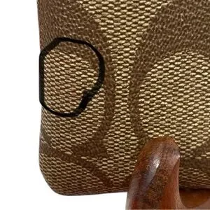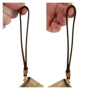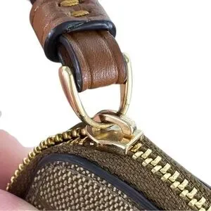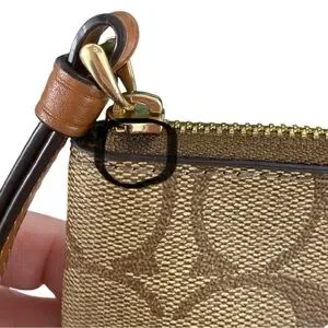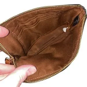 Excellent Used Condition: Wristlet has a tiny spot of red color transfer on front right near bottom and back right near bottom. I’ve circled these as they are very light and I didn’t even see them until I was in super bright light. There is a tiny dark spot on zipper and the gold tone is starting to coming off of the zipper pull. The inside has a small stain. This is all visible in photos and video.