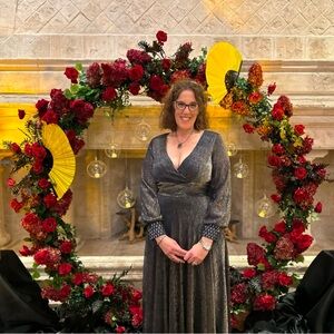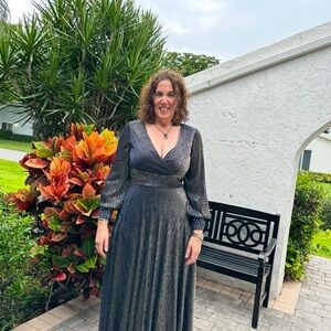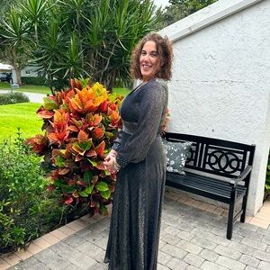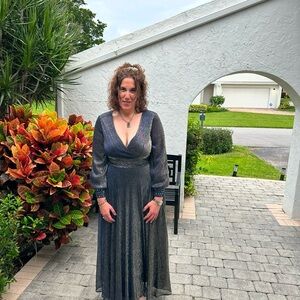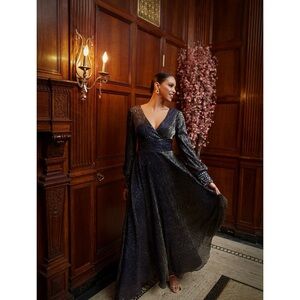 I wore once for 2 hour event in November— and that’s it! In mint condition!! Perfect for your next event!! I got so many compliments that night! This is sexy, fun and light weight for a fancy gown! Loved the beaded detail on the cuffs! Color is navy and gold metallic— it is cosmic in description and truly is a stunner! Photos don’t do it justice.