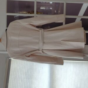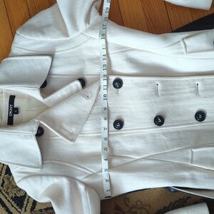 Excellent condition. All measurements are approximate. Stunning white peacoat with black buttons. 60% wool, 30% polyester, 10% viscose. Belt can be worn on white or black side. Black side is a leather-like material. Three close up photos show small marks but other than those, this is pretty spotless. Size 6, size small.