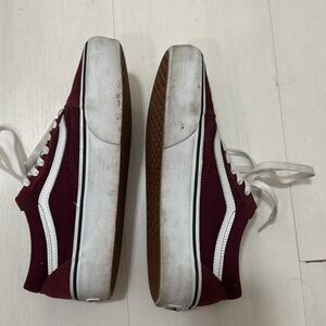 Women’s 8.5/mens 7 platform Vans. Gently used but can easily be spiffed up. No major defects. White laces and soles. Great comfy shoe, the maroon is a fun pop of color.