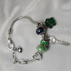 Ladies Charm Bracelet Love Key Green Glitter Animal Paw Print Heart Green Beaded Charm Bracelet Silver Tone
