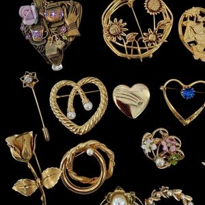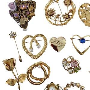22 brooches brooch gold tone flowers hearts faux pearls rose filigree. All photos 📷 were taken by me and are of the actual items. Keywords: brooch brooches pin pins rhinestones heart flower flowers pearl pearls