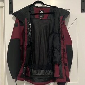 Stylish burgundy and black jacket by Outdoor Research. Features a sleek design with multiple pockets. Perfect for outdoor adventures, skiing, or snowboarding.