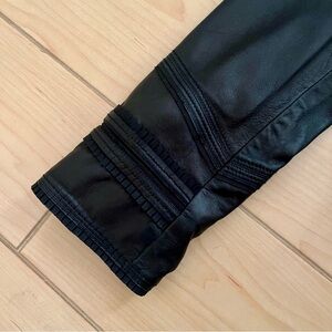 Authentic ELIE TAHARI for Bergdorf Goodman black leather jacket with pleated grosgrain trim. Stand collar with embellishments. Hooks and Eyes Closures. Pleated grosgrain trimmings throughout. Lightly padded shoulders; long sleeves with dark silver tone button cuffs. Mid weight soft, buttery leather; fully lined.