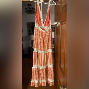 The tie around the neck is embroidered, and it is adjustable can be worn more modestly a higher, or can be loosened and worn lower