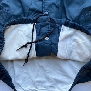 • Rare Vintage 80s NCAA Nylon Snap front Jacket that's between a bomber and coaches style jacket. Lightweight jacket with light knit lining in dark blue or faded navy with embroidered NCAA patch on the front, side slash pockets knit elastic cuffs and collar, and cinchable bottom waist. Classic nylon varsity, hockey, baseball snap up, coaches, grandpa, sporty, athletic vibes, perfect for NCAA March Madness college basketball.