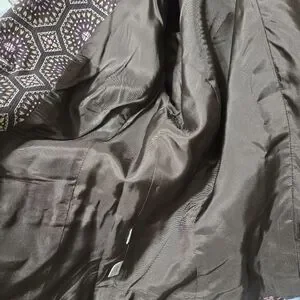 Stylish dark brown cropped blazer with a unique pink and tan geometric pattern. Features a button-up front, three-quarter sleeves, and is fully lined. There are 2 front pockets that are still sewn shut.