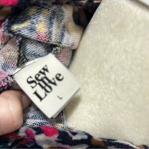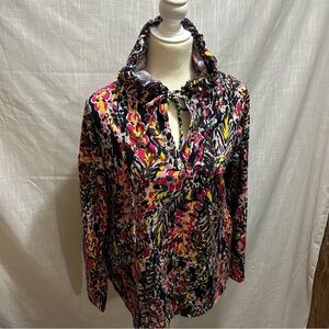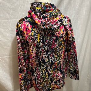 Pretty colorful sweater/top with hood in size L. Measures 21.5" pit-pit & 27" from shoulder-bottom. 97% polyester & 3% spandex. ties at top & has 2 side seam pockets. In EUC