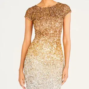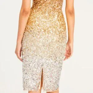 Beautiful and fun mid-length dress in a warm gold ombre sequin. Well constructed, with a soft lining for comfortable wear all night. Excellent condition, worn only once for my wedding dinner :) Enjoy this one!!