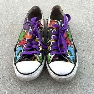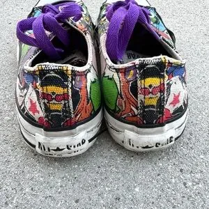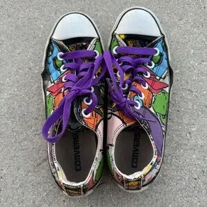 Converse Chuck Taylor All Star Sneakers Unisex Mens Womens rainbow graffiti cartoon characters animated drawings art abstract whimsical colorful multicolored purple classic weathered worn rare low top lace up