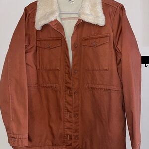 Stylish rust jacket with a cozy cream collar. Features button closure and front pockets. Perfect for casual wear.