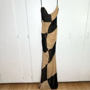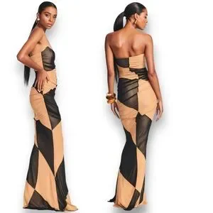 This stunning Retrofete Ford Mesh Dress in black and nude is perfect for any formal occasion. The dress features a sleeveless, strapless design with a sweetheart neckline and a zip closure. The long dress length and bodycon style make it a sexy and comfortable choice for weddings, parties, or cocktail events.