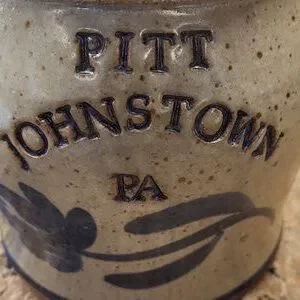 Handcrafted Pottery Utensil Holder - Pitt, Johnstown, PA. Unique utensil holder if you a an alumni for Pitt in Johnstown. Signed by the craftsman on the bottom. Approximately 6 inches high and 4 1/2 inches in depth. Speckled design with navy blue writing. Excellent condition, no chips or cracks.