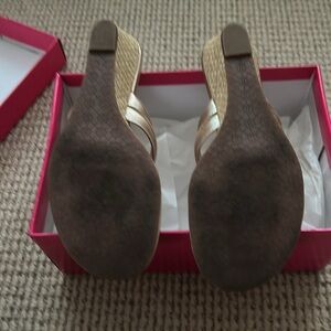 Lilly Pulitzer McKim gold metallic Wedge size 9. Worn once. A luxurious nappa leather thong sandal featuring the iconic metal O-ring detail and a chic straw wrapped wedge 2”heel.