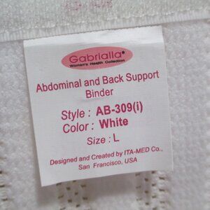This is a Gabrialla Abdominal and Back Support Binder in Size Large which fits 38.5 to 46 inches. It is recommended as a postpartum support or after abdominal surgical procedures. Provides a slimming effect to help get back into pre-pregnancy shape. Can also be used for abdominal hernia, after liposuction and as a breast binder.